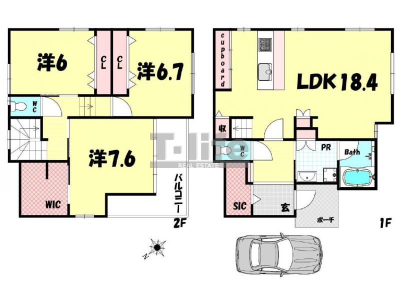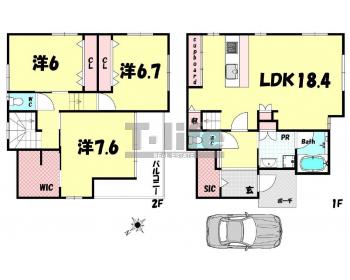 | 間取詳細 | 1階:LDK18.4 2F:7.6洋、6.7洋、6洋 | ||